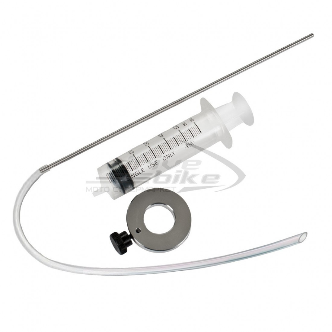 Инструмент для измерения уровня масла в вилке мотоцикла состоит из измерительного штока, гибкого шланга и шприца. Данный инструмент необходим для измерения и откачки масла до необходимого уровня в передней вилке мотоцикла.