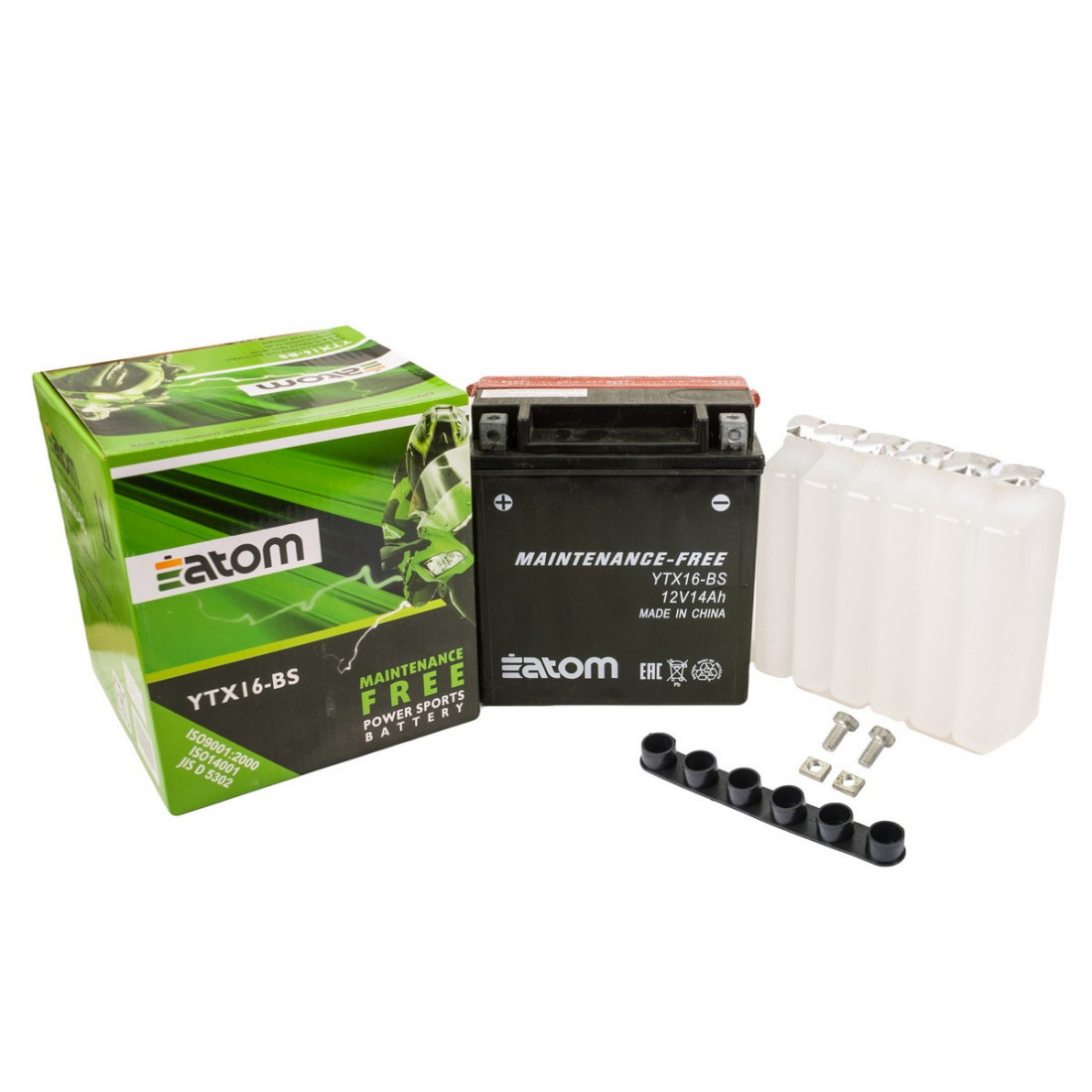 Мото аккумулятор ATOM YTX16-BS MF – это надежный современный аккумулятор по доступной цене, который не подведет Вас и долго прослужит вам и вашему мотоциклу. Все аккумуляторы Atom соответствуют стандартам JIS и ISO и производятся в соответствии со спецификациями аналогичных аккумуляторов Yuasa. При покупке обращайте внимание на необходимую силу пускового тока.