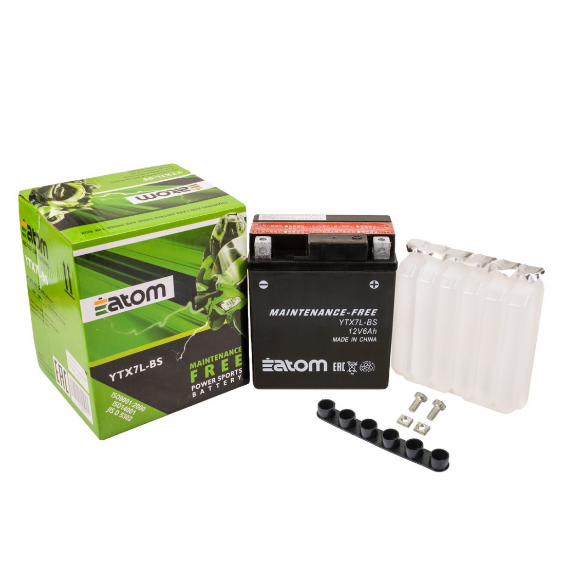 Мото аккумулятор ATOM YTX7L-BS MF – это надежный современный аккумулятор по доступной цене, который не подведет Вас и долго прослужит вам и вашему мотоциклу. Все аккумуляторы Atom соответствуют стандартам JIS и ISO и производятся в соответствии со спецификациями аналогичных аккумуляторов Yuasa. При покупке обращайте внимание на необходимую силу пускового тока.