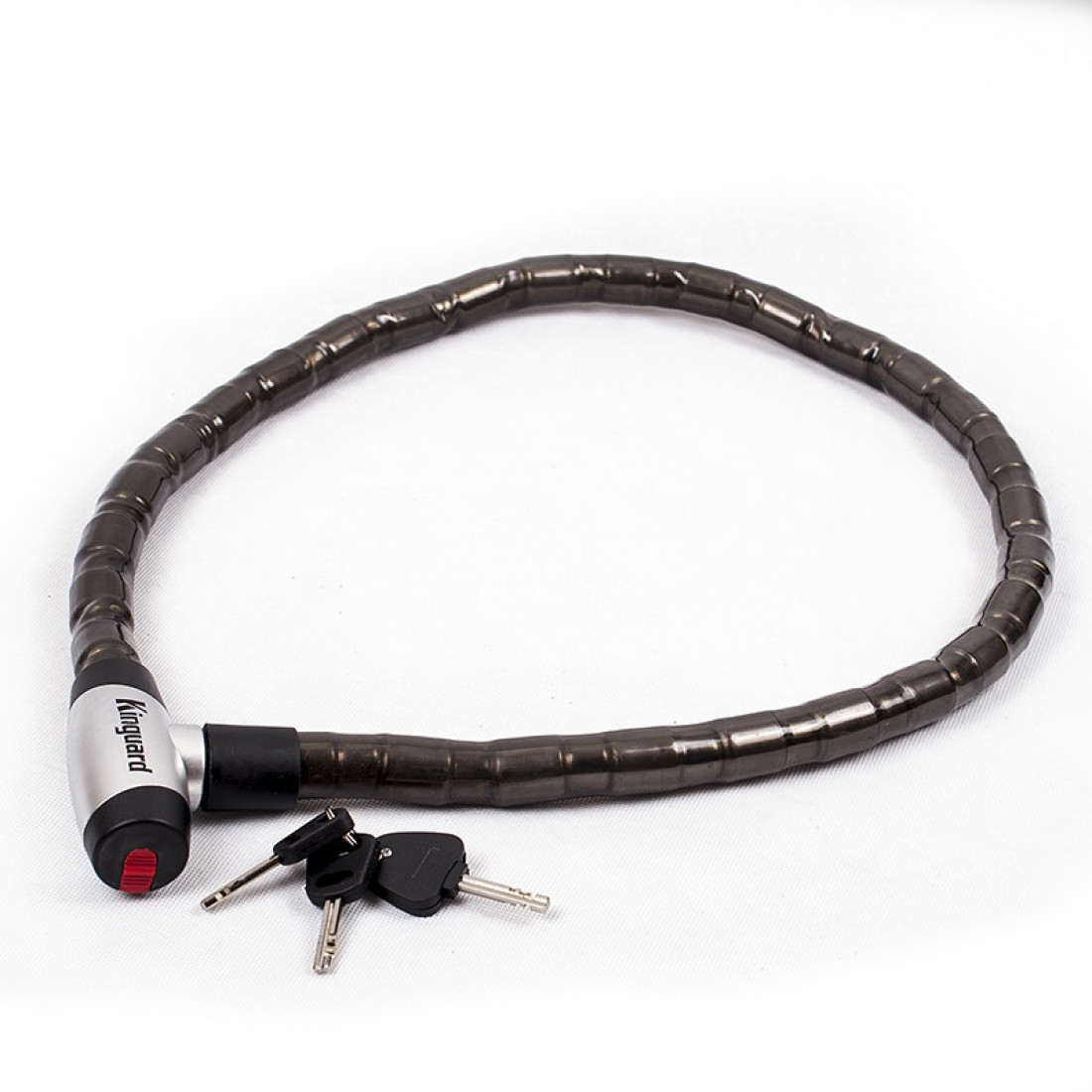 Противоугонный трос с замком 2016 фирмы Kinguard это отличное решение в плане безопасности вашего мотоцикла. Цепь данного замка находится в оплетке, что придает жесткости цепи и исключает возможность перекусить её обычными кусачками, а также сохряняет колесный диск от повреждений после установки. Звенья цепи защищены втулками из закаленной стали, которые еще больше усложняют процесс перепиливания.