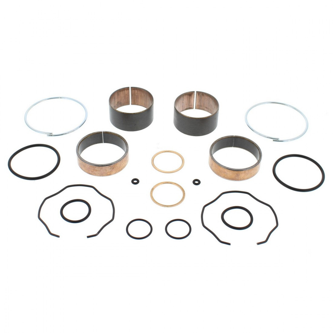 Комплект направляющих втулок в вилку мотоцикла ALL BALLS 38-6112 включает в себя две верхние направляющие втулки, две нижние направляющие втулки, четыре стопорных кольца, две медные шайбы и восемь уплотнительных колец.