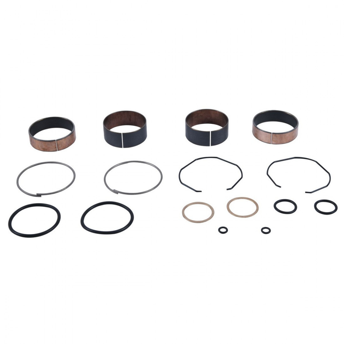 Комплект направляющих втулок в вилку мотоцикла ALL BALLS 38-6138 включает в себя две верхние направляющие втулки, две нижние направляющие втулки, четыре стопорных кольца, две медные шайбы и шесть уплотнительных колец.