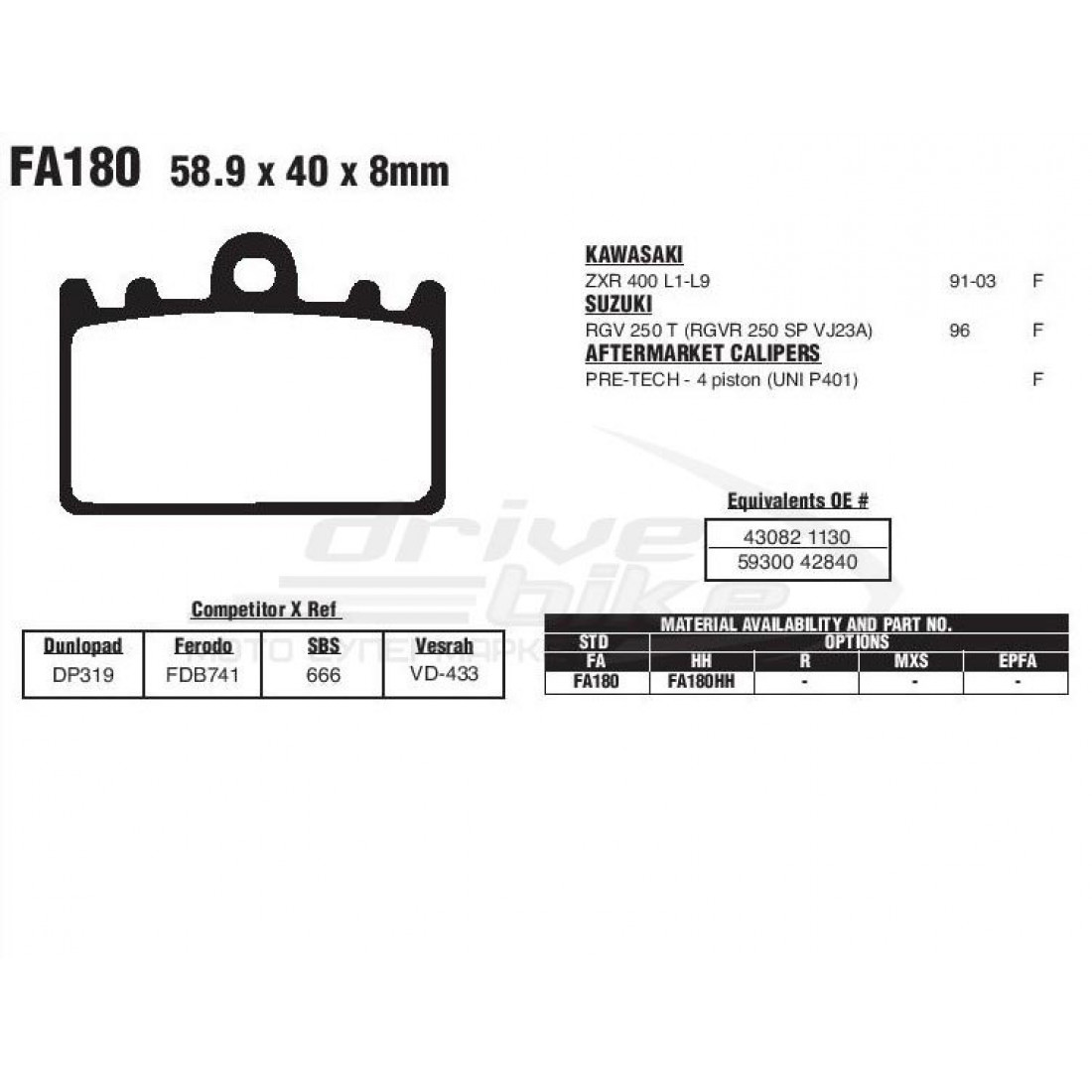 Тормозные колодки EBC FA180 серии Aramid обеспечивают эффективное торможение при любых погодных условиях и стабильные характеристики в независимости. В составе колодок присутсвует материал Aramid, который используется для предотвращения перегрева и преждевременного истирания тормозных колодок, что гарантирует стабильное торможение и длительный срок службы. Имеют хорошую износостойкость и не агрессивны к тормозным дискам. Рекомендованы для использования на классических мотоциклах, чопперах и крузерах.