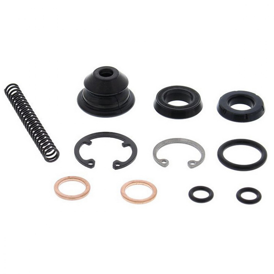 Ремкомплект переднего главного тормозного цилиндра ALL BALLS 18-1068 включает в себя два сальника, возвратную пружину, стопорное кольцо, пыльник и две медные шайбы под банджо болт.