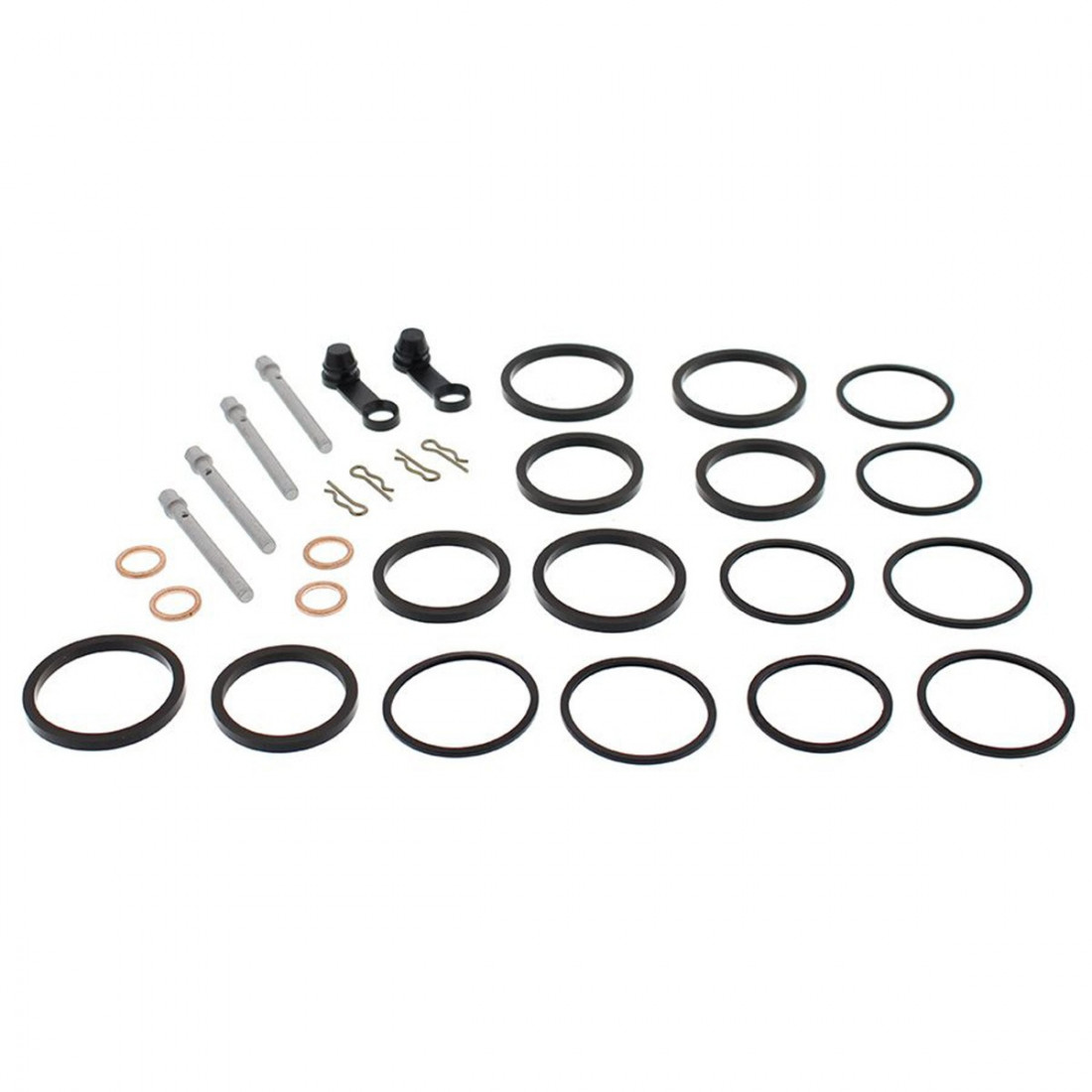 Ремкомплект тормозного суппорта ALL BALLS 18-3091 включает в себя пыльники, сальники, штифты тормозных колодок, колпачки штуцера прокачки, медные шайбы.