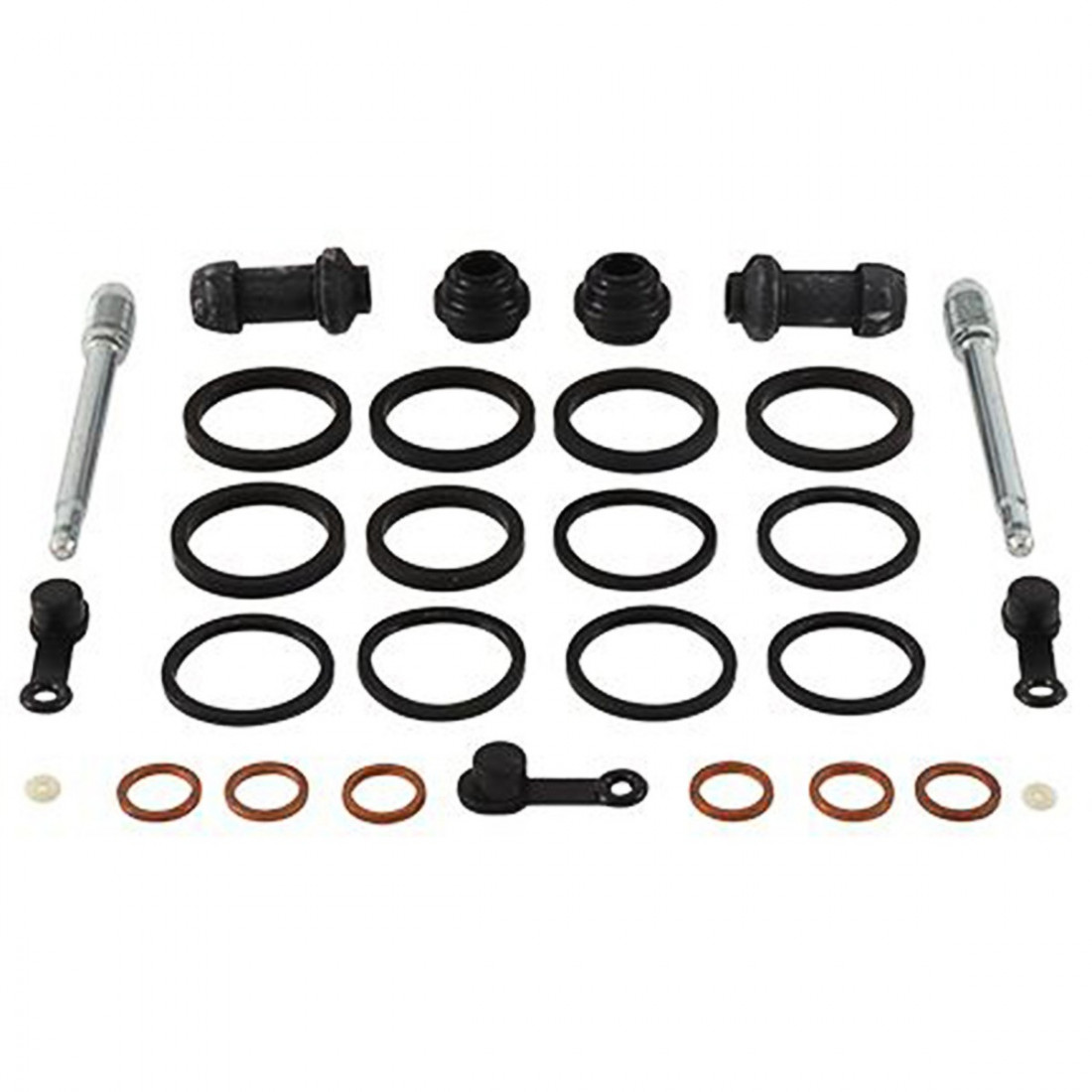 Ремкомплект тормозного суппорта ALL BALLS 18-3184 включает в себя пыльники, сальники, штифты тормозных колодок, колпачки штуцера прокачки, медные шайбы.